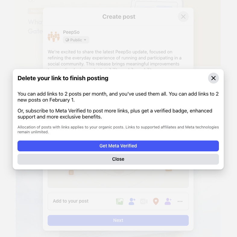 Not spam links. Not scams. Not abuse. Plain, ordinary links. The most basic building block of the internet. Post too many and you’re blocked from finishing your own post unless you delete the link or pay. Pay for Meta Verified, and suddenly the restriction disappears. That’s the transaction. No discussion. No explanation. Just a system message calmly informing you what you are now allowed to do.